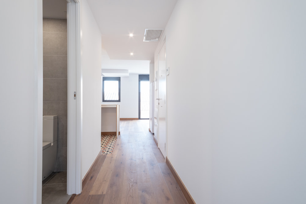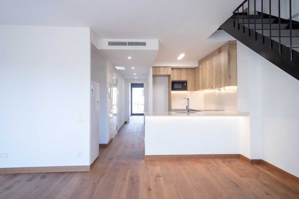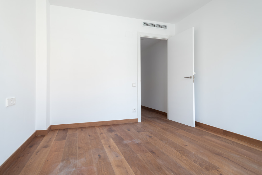 Pavimento de parquet laminado multicapa de la marca Porcelanosa en toda la vivienda, excepto baños y lavaderos, que dispondrán de pavimento cerámico. Zócalo de madera lacada de color blanco en todo el perímetro de las estancias con parquet.