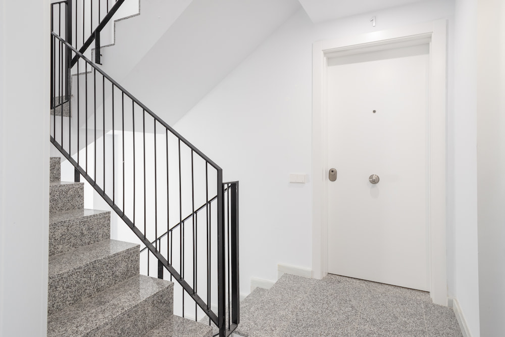 Puertas interiores con acabado en lacado blanco, dotadas con junta de estanqueidad (burlete de goma). Sistema de cierre a base de picaporte simple, con condena en baños y aseo.
