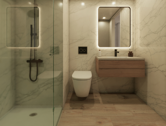 Electrificación elevada de 9.2 kW en cada vivienda. Cuadro general de distribución en ejecución empotrada dotado de protecciones contra sobretensiones, magnetotérmica y diferencial. Puntos de alumbrado y tomas de enchufe (16 A 2p+T) en todos los recintos según Reglamento Electrotécnico de Baja Tensión (REBT).